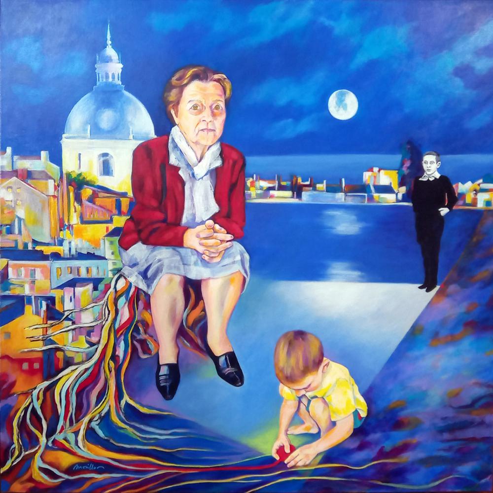 6. Fernando Pessoa, ou moi, ou le spectateur, enfant et adolescent. L’adolescent regarde la mère et l’enfant qu’il a été. L’enfant est dans sa bulle insouciant. Il joue avec une bobine… Il tire le lien du cordon ombilical formé par la racine qui mène à la terre comme à la mère.
