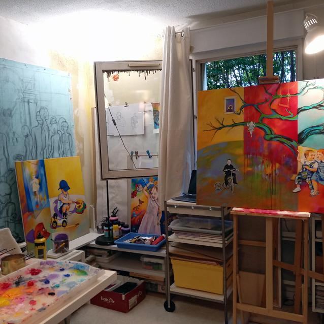 Je veux jouer sur le poids de l’émotion avec les surfaces colorées fortes qui contrastent avec la partie droite plus multicolore qui représente le pétillement de la vie, du souvenir heureux.
